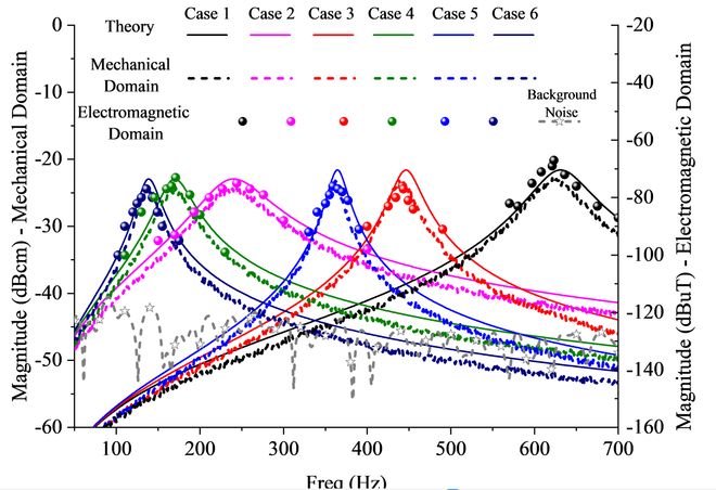 机械域和电磁域的测试结果如附图3和4所示。可以看出,在不同的弹簧条件下,ME天线在两个域中的频率响应特性与等效电路的结果具有很好的一致性。实验结果表明,工作频率、带宽和Q值调节范围分别为138~1133Hz、14~222Hz和2.85~22.57。该技术有望解决现有磁电天线的现实窄带问题和天线阵列应用中的工作频率偏差问题。
