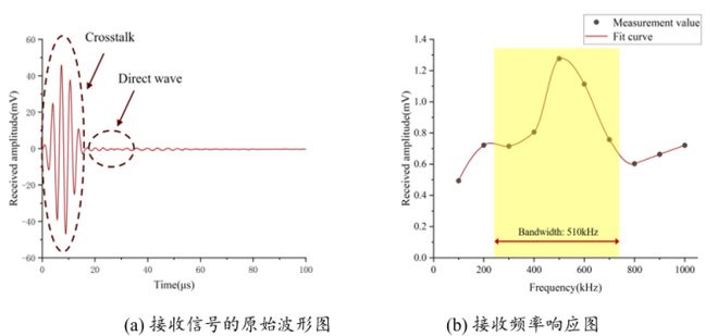 2、由图4可知,接收频率100-240kHz时,接收幅值随频率升高而减小,说明接收器谐振频率≤100kHz;240-510kHz时幅值随频率升高而增大,510kHz达极大值;此后幅值减小,750kHz降至极大值的50%。取fu=240kHz、fl=750kHz,计算得接收器中心频率fc=495kHz、带宽B=510kHz、相对带宽BW=103.0%,表明该换能器具备宽频带接收响应。