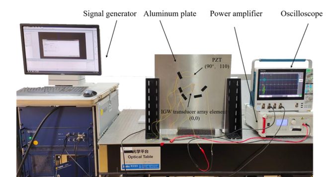依次激励幅值10V、频率100kHz-1.5MHz(步长100kHz)的五峰窄带调制正弦信号。激励实验中,放大器输出500V接换能器阵元;接收实验中,放大器输出100V接PZT(实验实拍图见图2)。