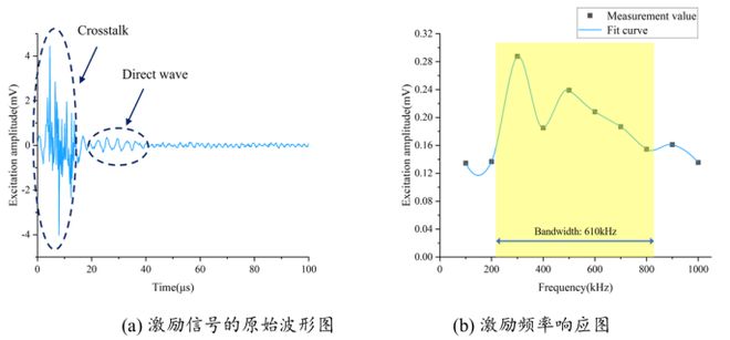 1、由图3可知,激励频率100-300kHz时,激励幅值随频率升高而增大,300kHz达最大值;400kHz出现极小值,500kHz出现第二个峰值;此后幅值逐渐减小,820kHz降至最大值的50%。取fu=210kHz、fl=820kHz,计算得激励器中心频率fc=505kHz、带宽B=610kHz、相对带宽BW=120.8%,表明该换能器具备宽频带激励能力。